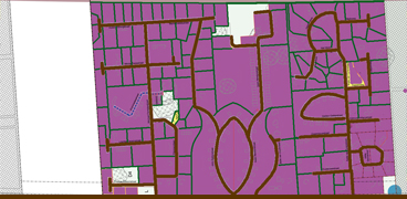 Kavelwegen (bruin) en doorwaadbare zone's (groen) rondom Tulp1.